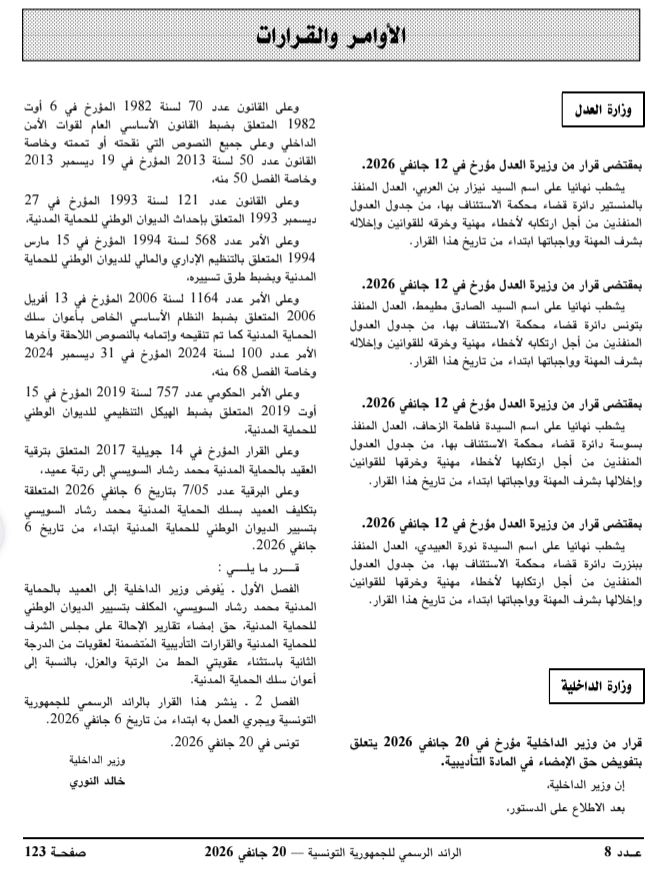 صدر بالعدد الأخير من الرائد الرسمي للجمهورية التونسية، قرار من وزيرة العدل مؤرخ في 12 جانفي 2026، يقضي بإعفاء 4 عدول منفّذين من جدول العدول.